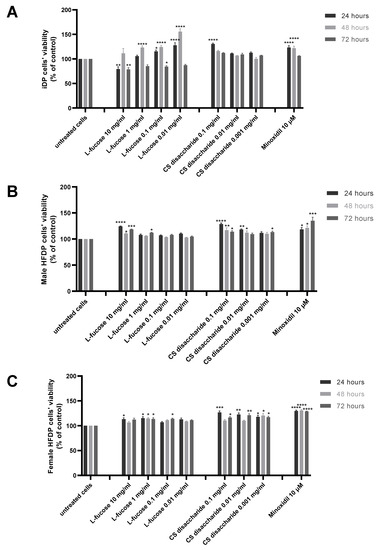 The results of experiments performed on three types of dermal papilla cells are presented in Figure 3. Two tested concentrations of L-fucose, 10 mg/mL and 0.1 mg/mL, caused a statistically significant decrease in the proliferation of immortalized dermal papilla cells (Figure 2A); however, the obtained results do not demonstrate a cytotoxic effect of the tested sample. In the case of primary cell lines (Figure 2B,C), the tested L-fucose and chondroitin disaccharide Δdi-4S sodium salt significantly stimulated the proliferation of male- and female-derived dermal papilla cells. A statistically significant increase in hair cell proliferation in comparison to the untreated cells was also observed for 10 µM minoxidil.