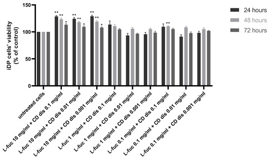 Effect of the simultaneous treatment of immortalized dermal papilla cells with L-fucose and chondroitin disaccharide Δdi-4S sodium salt. Cells were treated with different concentrations of tested samples for 24, 48, and 72 h, and proliferation was assessed using PrestoBlue® Cell Viability Reagent. The data are presented as the means ± SEM. Statistical significance in comparison to the negative control (untreated cells) was assessed using a one-way ANOVA followed by Dunnett’s multiple comparison test; * p < 0.05; ** p < 0.01.