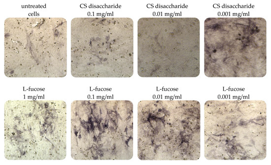 Immortalized dermal papilla cells cultured for 120 h in media containing L-fucose or chondroitin sulphate disaccharide sodium salt displayed alkaline phosphatase activities (Figure 5). The results of the histological analysis showed an increase in the enzyme activity (bluish violet color). The highest intensity of staining in comparison to untreated cells was observed when dermal papilla cells were cultured with two concentrations of L-fucose, 0.1 mg/mL and 0.01 mg/mL. Fewer violet cells were noted in the chondroitin sulphate disaccharide-treated group, especially at a concentration of 0.001 mg/mL.