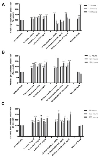 The results from the quantitative analysis of enzyme production indicated that tested samples significantly increase alkaline phosphatase expression, this was especially visible in the case of L-fucose used at the three sampled concentrations and chondroitin sulphate disaccharide at the lowest concentration, 0.001 mg/mL (Figure 6A).