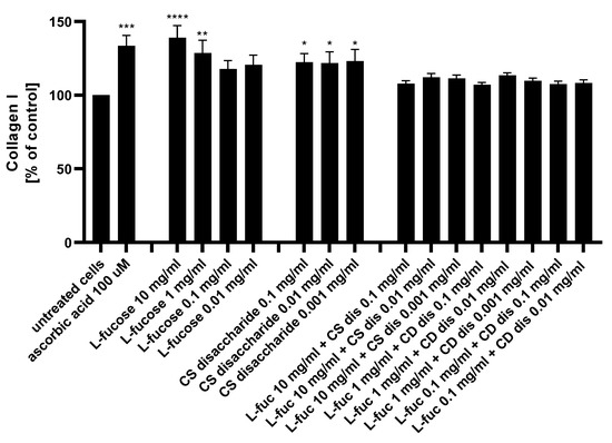 Collagen I production measured by ELISA in HDFa after treatment with L-fucose and chondroitin disaccharide Δdi-4S sodium salt. HDFa was treated with different concentrations of the tested samples for 48 h. Results are presented as a percentage of the untreated cells ± SEM. Statistical significance in comparison to the negative control (untreated cells) was assessed using a one-way ANOVA followed by Dunnett’s multiple comparison test; * p < 0.05; ** p < 0.01; *** p < 0.001; **** p < 0.0001.