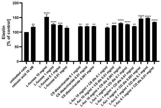 As presented in Figure 10, both tested samples, used alone or in combination, exhibited a statistically significant increase in elastin production by human dermal fibroblasts. Of the 15 treatments evaluated, 4 caused a significantly higher increase in the protein expression when compared to the positive control: 10 µM retinoic acid (p < 0.01)–10 mg/mL L-fucose; 1 mg/mL L-fucose + 0.001 mg/mL CS dis; 0.1 mg/mL L-fucose + 0.1 mg/mL CS dis; and 0.1 mg/mL L-fucose + 0.001 mg/mL CS dis. When L-fucose was used alone at a concentration of 10 mg/mL, the elastin expression level was significantly higher compared to the protein production obtained after simultaneous treatment with the same concentration of L-fucose and 0.1 mg/mL (p < 0.0001), 0.01 mg/mL (p < 0.001), and 0.001 mg/mL (p < 0.01) chondroitin sulphate disaccharide. A combination of 0.1 mg/mL L-fucose and 0.1 mg/mL chondroitin sulphate disaccharide resulted in a significantly higher elastin production than that achieved by either L-fucose or chondroitin sulphate disaccharide alone.