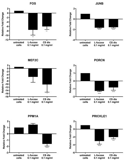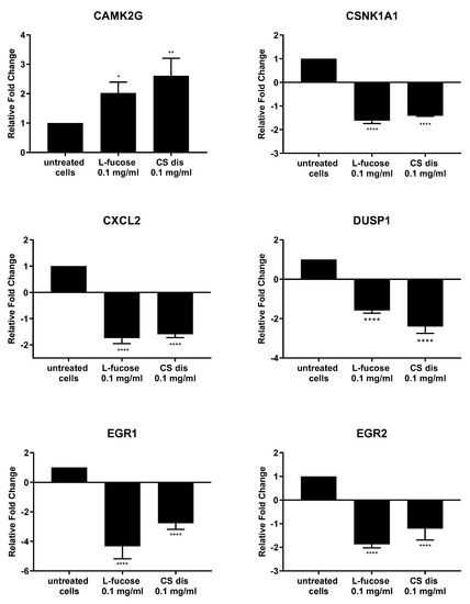As can be seen from Figure 11, both tested samples, L-fucose and chondroitin sulphate disaccharide, caused similar changes in the genetic level. The only exception is the PPM1A gene, the expression of which was significantly down-regulated by CS disaccharide and up-regulated (lack of statistical significance) by L-fucose. In general, treatment of male dermal papilla cells with L-fucose caused an up-regulation of the expression of two genes (CAMK2G and PPM1A) and down-regulation of ten (CSNK1A1; CXCL2; DUSP1; EGR1; EGR2; FOS; JUNB, MEF2C; PORCN; and PRICKLE1). Chondroitin sulphate disaccharide at a concentration of 0.1 mg/mL up-regulated the expression of one gene of interest, CAMK2G, and down-regulated the expression of all other eleven genes.