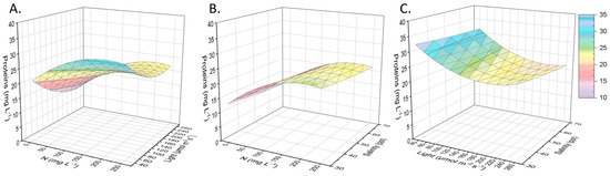 | Run | Nitrogen (mg L−1) | Salinity (ppt) | Light (μmol m−2 s−1) | Biomass (mg/L) (Average ± SD) |
