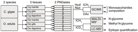 Three organs, namely the gills, digestive tract and mantle, were collected from three separate batches of ten–fifteen individuals from two different species of oysters C. gigas and O. edulis, and immediately processed according to a standard procedure for N-linked glycans isolation [33]. Briefly, whole proteins and glycoproteins were solubilized from tissues using ultrasound treatment in the presence of triton X100. After removing insoluble materials using centrifugation, the glycoproteins were reduced and alkylated prior to enzymatic cleavage with trypsin in order to facilitate the action of peptide-N-glycosidases (PNGases) used to release N-glycans from asparagine residues. N-glycans were sequentially released using two PNGases, i.e., PNGase F [34] then PNGase A [35], generating two pools of N-glycans according to the presence or not of C3 substitution, generally by a Fuc residue, of the reducing GlcNAc of the chitobiose core. The two sub-glycomes, i.e., PNGase F and PNGase A, were analyzed individually in order to obtain a more complete interpretation of the spectra.