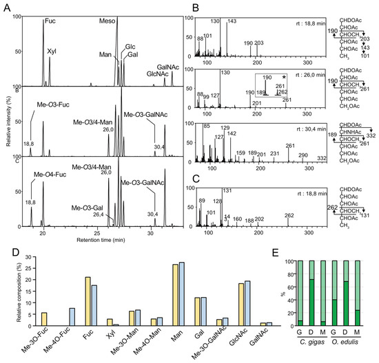Monosaccharide composition analysis of N-glycans. (A) Total ion count generated from GC-MS analysis of itol-acetate derivatives of (top) authentic standards, (middle) N-glycans released from the mantle of C. gigas with PNGase F, (bottom) N-glycans released from the mantle of O. edulis wit PNGase F. (B) EI-MS fragmentation patterns of itol-acetates signals from C. gigas at (top) 18.8 min identified as Me-O3-Fuc; (middle) 26.0 min identified as Me-O3-Man; inset (*) corresponds to a minor signal identified as Me-O4-Man; and (bottom) 30.4 min identified as Me-O3-GalNAc. (C) EI-MS fragmentation patterns of the itol-acetates signal at 18.8 min from O. edulis identified as Me-O4-Fuc, all other signals were identical to C. gigas. (D) Relative quantifications (in %) of monosaccharides calculated as the sum of individual signals of N-glycans released with PNGase F and A from the three tissues of C. gigas (yellow) and O. edulis (blue). The percentage of Me-3O-Man and Me-4O-Man was determined by computing the ratios of signals at m/z 190/261 vs. m/z 189/262 recorded on the EI-MS spectra. (E) Ratios (in %) of Me-3O-Man (light green) and Me-4O-Man (dark green) in N-glycans isolated from individual tissues of C. gigas and O. edulis (G, gills; D, digestive tissue; M, mantle).