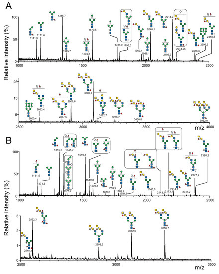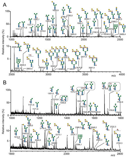 - Yu, S.-Y.; Wu, S.-W.; Khoo, K.-H. Distinctive Characteristics of MALDI-Q/TOF and TOF/TOF Tandem Mass Spectrometry for Sequencing of Permethylated Complex Type N-Glycans. Glycoconj. J. 2006, 23, 355–369. [Google Scholar] [CrossRef]