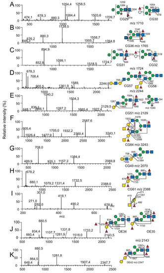 Selection of MS2 and MS3 spectra for representative permethylated N-glycans. MS2 spectra of N-glycans (A) CG29 and CG30, (B) CG36, (C) CG31 and CG32, (D) CG57 and CG58, (E) CG51, (F) CG84, (G) CG49 and (H) CG61 released from C. gigas with PNGase F. MS2 spectra of N-glycans (J) OE34 and OE35 and (K) OE42 released with PNGase A from O. edulis. All glycans were permethylated prior to their analysis. (I) MS3 spectrum of the m/z 678 ion generated during MS2 analysis of the N-glycan CG61. N-glycan structures were represented according to the standard Symbol Nomenclature for Glycans system [39].