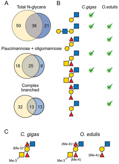 Although belonging to the same Ostreoidea superfamily, the two oyster species Crassostrea gigas and Ostrea edulis showed very different N-glycan profiles in terms of variability, modification to the ManGlcNAc2 core, expression of terminal antigens and methylation patterns. Of the 109 unique N-glycans identified, i.e., 88 in C. gigas and 59 in O. edulis, excluding the variability generated by methylation modification, only 38 were common to both species (Figure 6). Most of these common glycans are oligomannosylated and paucimannosylated N-glycans, leaving only 13 that present complex-type branches commonly expressed in both species.