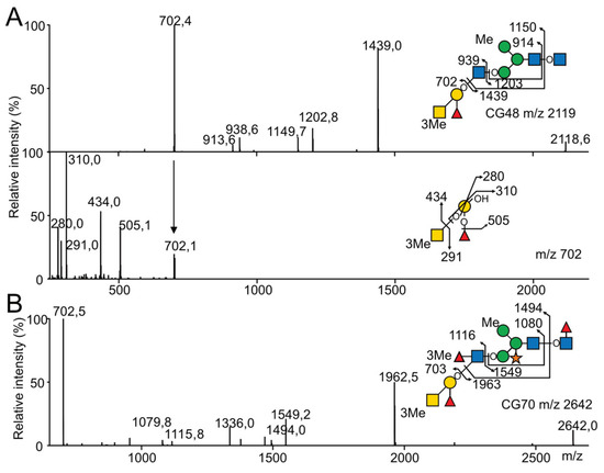 MALDI MS sequencing of the partially methylated and deuteromethylated N-glycans from C. gigas for the precise location of the methyl group. (A) MALDI-MS2 and MS3 spectrum of N-glycan CG48 and (B) MALDI-MS2 of N-glycan CG70. N-glycans were released with peptidyl-N-glycosidase F from C. gigas and permethylated with I-CD3 prior to their analysis. For CG48, the MS2 signal at m/z 702 corresponding to the monomethylated terminal A antigen was selected for MS3 fragmentation.