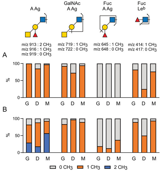 Relative quantification of the native and methylated forms of A Ag and Leb Ag. Deuteromethylated N-glycans of C. gigas and O. edulis were analyzed using LC-MS2. Characteristics of the MS2 ions for individual antigens and their respective methylated forms were identified as depicted on top. Proportions of methylated individual glycan epitopes were quantified in N-glycans isolated from the three tissues of (A) C. gigas and (B) O. edulis. Light gray, 0 CH3 group; orange, 1 CH3 group; blue, 2 CH3 groups. G, gills; D, digestive tract; M, mantle.