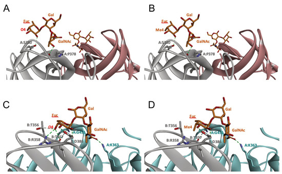 However, the GI.1 strain seems to recognize both saccharides Me-3O-GalNAcα1-3(Fucα1-2)Galβ and Me-3O-GalNAcα1,3(Me-4O-Fucα1,2)Galβ in a similar manner. The oxygen (O) at position 4 of GalNAc makes a hydrogen bond (HB) with Pro378, whereas the O2 of Fuc makes an HB with Ser380 of GI-1 (Figure 10 A). In comparison, recognition by GII.3 seems stronger as it involves a larger number of HBs (Figure 10 B). The Fuc residue makes five HB with Gly451, Asp386, Thr357 and Arg358 and two carbon HBs (CHBs) with the Thr356 and Thr357 of TV24 virus, and the GalNAc residue makes one HB with Lys363 of TV24 when only GalNAc is methylated at position 3. The methylation of Fuc at position 2 causes the loss of two HBs and one CHB. These observations suggest that the attachment of the GII.3 strain to the glycans in the C. gigas oyster species is stronger than that in the GI.1 strain. However, the attachment of the latter strain should be similar between the two oyster species, whereas binding of the GII.3 virus by Ostrea edulis may certainly be weaker than that by Crassostrea gigas depending on the quantity and proportion of Me-3O-GalNAcα1,3(Fucα1,2)Galβ and Me-3O-GalNAcα1,3(Me-4O-Fucα1,2)Galβ in O. edulis.
