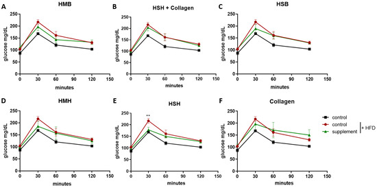Monitoring the effect of fish-derived hydrolysates in high-fat diet-induced insulin resistance. (A–F) Mice were fed with the indicated nutritional supplements and then subjected to a glucose tolerance test. Black color indicates the group of mice consuming the lean diet, and red color indicates the group of mice consuming the high-fat diet used as control. Graphs represent mean ± SEM. A 2-way ANOVA test was performed. ** p < 0.01.