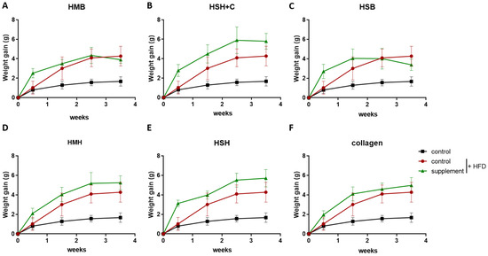 The effect of fish-derived hydrolysates in weight accumulation during a high-fat diet (A–F). Black color indicates the group of mice consuming the lean diet, and red color indicates the group of mice consuming the high-fat diet used as control. Graphs represent mean ± SEM. A 2-way ANOVA test was performed. No statistical significance was observed.