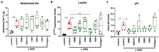 The effect of fish-derived hydrolysates in abdominal fat accumulation (A), Leptin gene expression (B), and urine pH (C) during a high-fat diet. A Mann–Whitney t-test was performed. * p < 0.05, ** p < 0.01, *** p < 0.001.