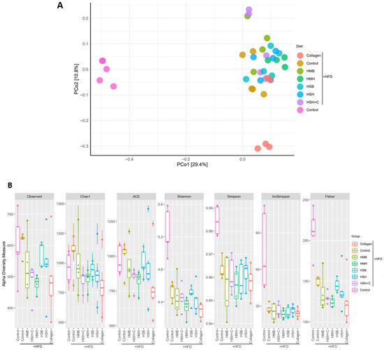The gut microbiome, reaching up to 100 trillion cells, is composed of up to 150 times the number of genes of a human [29], rendering the latter capable of physiological functions that would normally not be able to be executed, as well as protected from or prone to a number of pathologies, depending on its composition. Multiple aspects of host metabolism and adiposity are modulated by the gut flora, for example, through the regulation of host gene expression and metabolic or inflammatory signaling pathways, as well as through affecting the behavior of the host via the gut–brain axis [30]. The gut microbiome is, in turn, shaped by a number of factors, including dietary components. The intestinal microbiota is altered in obesity and has been highlighted as a critical contributor to the development of obesity, diabetes, and metabolic syndrome [31]. Therefore, we examined the role of fish-derived protein hydrolysates in restoring the HFD-induced disturbances of the gut microbiome’s composition. Fecal samples were collected from animals following an HFD enriched with 5% fish sidestream-derived protein hydrolysates for 3.5 weeks, fecal DNA was subsequently extracted, and amplicon metabarcoding analysis was performed through 16S rRNA gene sequencing. Principal Coordinates Analysis (PCoA) was conducted based on the identified OTUs, to access the genetic clustering of the microbiome of the different diet groups (Figure 4A).
