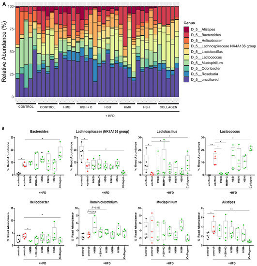 The effect of fish-derived dietary supplements on gut microbiome top genera composition. (A) Normalized bar plots of genera abundances (%) based on the identified OTUs; (B) Boxplots representing the abundance of different genera following diet supplementation. Mann–Whitney t-test was performed. * p < 0.05, ** p < 0.01.