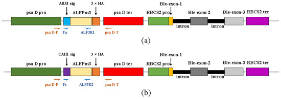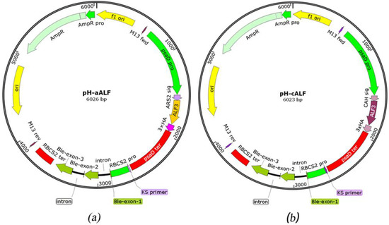 ARS1 signal peptide [27] and CAH1 signal peptide [31] were selected to construct the fusion protein with ALFPm3 from P. monodon. The fusion fragments were named ARS1-ALFPm3 and CAH1-ALFPm3, respectively. In order to improve the transformation efficiency and enhance the heterologous expression of C. reinhardtii, the coding sequence of ALFPm3 (Genbank number: JQ256520) was optimized based on the codon bias of the genome of C. reinhardtii. Subsequently, fusion fragments tailed with 3 × HA tag were inserted into the expression vector pESVH to obtain the plasmid pH-aALF (Figure 5a) and the plasmid pH-cALF (Figure 5b). The “ARS1-ALFPm3-3 × HA tag” and “CAH1-ALFPm3-3 × HA tag” expression cassettes were driven by the pasD promoter and the pasD terminator. The RBCS2 promoter and the RBCS2 terminator were used to drive the expression of sh-ble given the transformants with zeocin resistance. The transformation of C. reinhardtii JUV was performed using the glass bead method according to the literature [68]. Transformed C. reinhardtii cells were selected on a TAP agar plate containing 100 µg/mL ampicillin and 10 µg/mL zeocin at 22 °C, with continuous light intensity 90 μE·m−2·s−1 for 2–3 weeks until green colonies appeared. The number of colonies was recorded and used to calculate the transformation frequency.