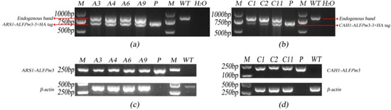 Genomic PCR analysis and RT-PCR analysis of transgenic algae. (a) Genomic PCR analysis of T-JaA. (b) Genomic PCR analysis of T-JcA. (c) RT PCR analysis of T-JaA. (d) RT PCR analysis of T-JcA. Endogenous band: Genomic PCR analysis of the endogenous gene of C. reinhardtii. ARS1-ALFPm3-3 × HA tag: Genomic PCR analysis of ARS1-ALFPm3-3 × HA tag gene in T-JaA. CAH1-ALFPm3-3 × HA tag: Genomic PCR analysis of CAH1-ALFPm3-3 × HA tag gene in T-JcA. ARS1-ALFPm3: RT-PCR analysis of ARS1-ALFPm3 gene in T-JaA. CAH1-ALFPm3: RT-PCR analysis of CAH1-ALFPm3 gene in T-JcA. β-actin: RT-PCR analysis of β-actin gene. M: DL 2000 DNA ladder marker. P: Positive control. WT: C. reinhardtii JUV. H2O: blank control. A3, A4, A6, A9: Candidates of T-JaA. C1, C2, C11: Candidates of T-JcA.