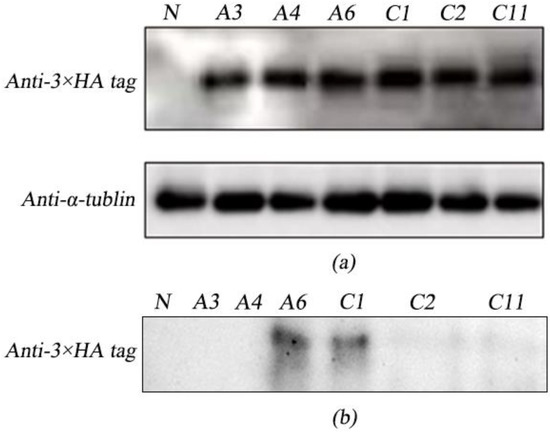 The immunoblot analysis of intracellular and secretory proteins extracted from genetically engineered algae T-JaA and T-JcA. (a) Immunoblot analysis of proteins from algal cells of T-JaA and T-JcA. (b) Immunoblot analysis of proteins from the culture medium of T-JaA and T-JcA. Anti-3 × HA tag: protein extract was incubated with mouse anti-3 × HA tag antibody for testing the existence of 3 × HA tag proteins. Anti-α-tublin: protein extract was incubated with mouse anti-α-tublin tag antibody for testing the existence of α-tublin. N: Negative control. A3, A4, A6: Candidates of T-JaA. C1, C2, C11: Candidates of T-JcA.