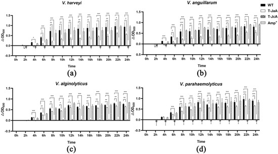 The effects of protein extracts from T-JaA6 and T-JcA1 on the growth of aquaculture pathogenic bacteria. The data were analyzed statistically. (a) V. harveyi. (b) V. anguillarum. (c) V. alginolyticus. (d) V. parahaemolyticus. WT: culture supernatant of C. reinhardtii JUV. T-JaA6: culture supernatant of T-JaA6. T-JcA1: culture supernatant of T-JcA1. Amp+: ampicillin (2 mg/mL).*, **, ***: statistically difference at the level of 0.05, 0.01, and 0.001, respectively.