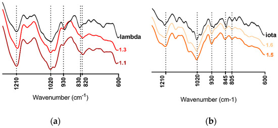 FTIR spectra of the polysaccharide fractions 1.1 and 1.3 of Halymenia floresii compared to commercial lambda-carrageenans (a), and fractions 1.5 and 1.6 of Solieria chordalis compared to commercial iota-carrageenans (b).