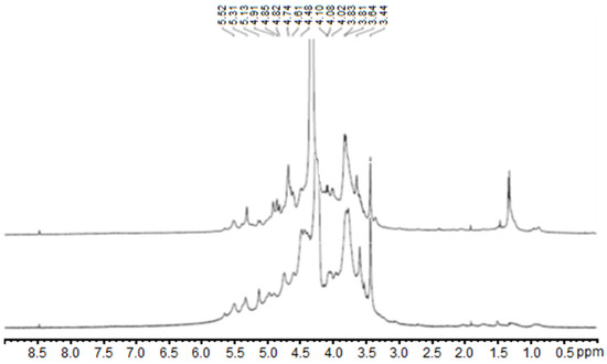 1H NMR spectra of the polysaccharide fractions 1.1 (bottom) and 1.3 (top) from Halymenia floresii, corresponding to the dialyzed and ion exchange purified fractions, respectively.