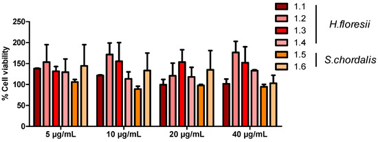 Calu-3 cells were cultured in 96-well plates at 6 × 104 cells per well in 0.1 mL of DMEM/F12 up to 80% confluence before being incubated with H. floresii and S. chordalis fractions at concentrations of 5, 10, 20, and 40 µg/mL. Cell viability was assessed after 24 h incubation using the cell proliferation kit II (XTT; Roche Diagnostics, Meylan, France) in accordance with the manufacturer’s instructions and compared with non-treated cells. All experiments were performed in duplicate.