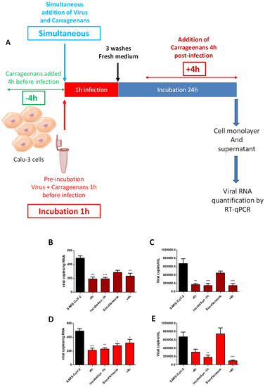 Time of addition experiments carried out subsequently did not reveal any significant differences between the conditions tested. Indeed, pre-treatment showed similar results on the inhibition of virus replication as the treatment after infection with SARS-CoV-2. These results suggest that carrageenans could be used both before the infection, prophylactically, as well as after the infection, therapeutically.