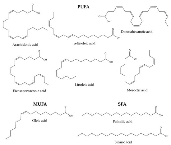 Chemical structures of some MUFA, PUFA, and SFA molecules found in the skin mucus of gilthead sea bream and flathead grey mullet [118,119].