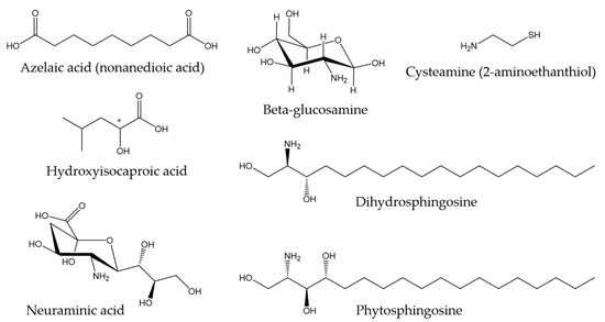 Regarding other types of molecules, Ekman et al. (2015) [121] described the metabolite profile of fathead minnow (Pimephales promelas) skin mucus with the aim of providing a tool for environmental monitoring and surveillance. Some of the metabolites found are associated with antibacterial properties. For instance, azelaic acid has been shown to inhibit bacterial growth by interfering with protein synthesis [122], and hydroxyisocaproic acid has been found to be effective against both bacteria and fungi [123]. In another study conducted by Patel et al., (2020) [124], the metabolic profile of the skin mucus of the pool barb (Puntius sophore) was characterized. In this research, compounds found with proven antimicrobial activity included amino sugars, such as glucosamine and neuraminic acid, cysteamine (organic disulfide), dihydrosphingosine (amino alcohol), and phytosphingosine (sphingolipid), among others. Figure 2 shows the chemical structures of the compounds mentioned in this paragraph.