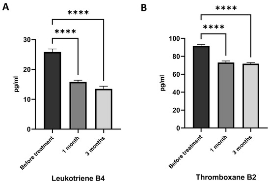 | Leukotriene B4 (LTB4), pg/mL | 12.06 ± 0.61 | 25.81 ± 1.02 **** |