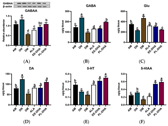 In PTZ-induced epilepsy, the level of γ-aminobutyric acid (GABA) with presynaptic inhibitory function is significantly decreased, and meanwhile glutamate (Glu) is highly active, which mainly acts as an excitotoxic, postsynaptic excitatory neurotransmitter [16]. For GABAA receptor expression, PTZ injection resulted in a decrease in GABAA receptor expression, which was further exacerbated by n-3 PUFA deficiency in early life but was restored to varying degrees by different types of n-3 PUFAs in adulthood (Figure 2A). As is shown in Figure 2B,C, administration of PTZ resulted in a significant decrease in GABA and a dramatic increase in Glu compared to the n-3 PUFA-deficient control group (DN). Notably, GABA abundance in the n-3 PUFA deficient group treated with PTZ (DM) was 54.3% lower than that in the n-3 adequate group (AM) group, while Glu was 33.6% higher in the DM group than that in the AM group. Supplementation with different types of n-3 PUFAs in adulthood for 17 days was effective in reducing Glu and GABA imbalances induced by PTZ injection, and the effect of DHA-enriched phospholipid was significant compared to DHA-enriched ethyl ester and α-LNA.