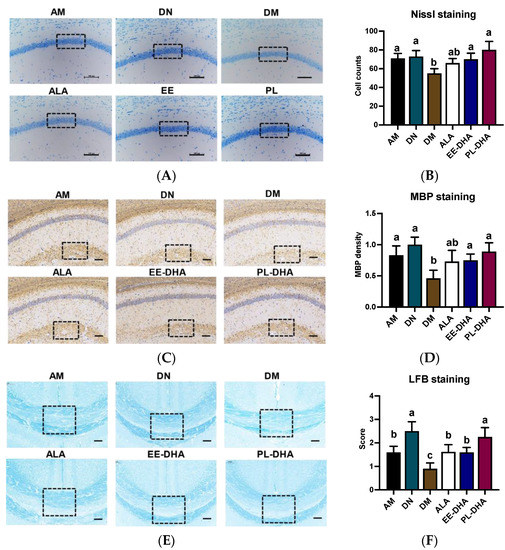 To further demonstrate PTZ-induced defects in the central nervous system (CNS), we performed luxol fast blue (LFB) staining and myelin basic protein (MBP) staining, a major constituent of CNS myelin and mature oligodendrocytes for myelin, on paraffin-embedded coronal sections. The results showed that there was a diminished staining of MBP in the brain of the n-3 PUFA-deficient mice after PTZ treatment (DM), as depicted by the staining intensity of MBP. Conversely, a restoration in MBP density was observed after different types of n-3 PUFA supplementation in adulthood (Figure 3C,D). Overall staining intensity of MBP in mice was markedly restored in the ALA, EE-DHA, and PL-DHA groups as compared to the DM group. Patterns of LFB in the brain were similar to the MBP intensity in mice (Figure 3E,F). The results showed that dietary n-3 PUFAs deficient in early life and adulthood showed severe demyelination in the brain after PTZ injection, compared to a diet that was adequate in n-3 PUFAs.