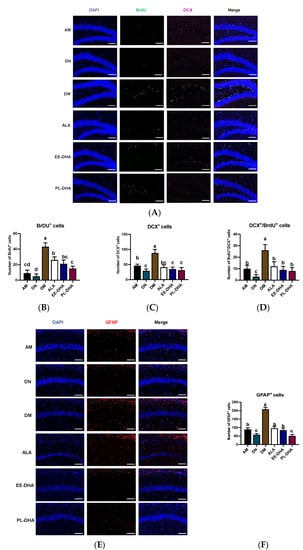 Apart from the injury to the CNS, PTZ-induced seizures could affect neurogenesis. The immune fluorescence of bromo-deoxyuridine (BrdU) and doublecortin (DCX, an immature neuronal marker) paradigm reflects a combination of both neuron proliferation and subsequent survival at the time of sacrifice. Using double immunohistochemistry with DCX and BrdU (Figure 4), we demonstrated that the total number of immature neurons and neuronal-oriented precursors double-labeled with BrdU and DCX was affected by dietary n-3 PUFA levels in early life following PTZ administration. As shown in Figure 4A, the number of BrdU-positive cells was significantly increased in n-3 PUFAs-deficient mice compared with n-3 PUFAs-adequate mice after PTZ injection to induce epilepsy, and supplementation with different types of n-3 PUFAs in adulthood could significantly reduce the incorporation of BrdU in the hippocampal dentate gyrus (DG) region. Interestingly, the expression of DCX in the hippocampal DG region was nearly consistent with BrdU, and neurogenesis was correlated with total n-3 PUFA levels in the mouse brain. Furthermore, the majority of BrdU-positive cells in the hippocampus were double-labeled by DCX and BrdU, suggesting that PTZ-induced seizures affect neurogenesis (Figure 4B–D). As for the marker of astrocytes, the number of glial fibrillary acidic protein (GFAP)-positive cells in the CA1 region of the hippocampus after PTZ stimulation was significantly increased in the DM group compared with the AM group, implying that dietary n-3 PUFA deficiency aggravated the PTZ-induced activation of astrocytes effectively (Figure 4E,F). Supplementation with n-3 PUFA-enriched diets could decrease the hyperactivation of astrocytes. These results illustrated that the PTZ-induced abnormal neurogenesis in the mice fed with a n-3 PUFA-deficient diet in early life could be improved by different types of n-3 PUFA administration in adulthood, of which DHA-enriched phospholipid exhibited the most noticeable effect.