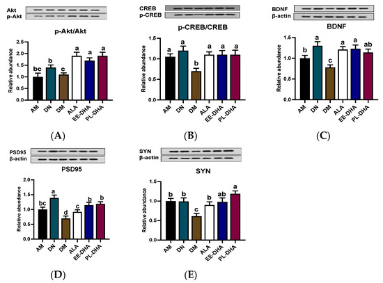 Inhibiting neuronal apoptosis to prevent epilepsy appears to be possible with the activation of the AKT/CREB/BDNF signaling pathway. The phosphorylation levels of AKT and CREB in the DM group showed a significant decline compared with those of the AM group, while supplementation with n-3 PUFAs could increase the phosphorylation levels of AKT and CREB. Notably, there was no significant difference among the ALA, EE-DHA, and PL-DHA groups (Figure 5A,B). The expression of BDNF in the six groups showed similarity to the expression trend of its upstream (Figure 5C). Moreover, DHA-enriched ethyl ester and DHA-enriched phospholipid supplementation for 17 days remarkably promoted the synaptic plasticity-related proteins PSD95 and SYN expression (Figure 5D,E).