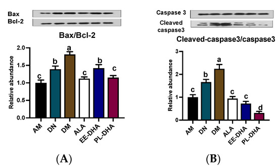 PTZ-induced epilepsy could lead to mitochondrial lesion, and further promote the development of hippocampus neuron apoptosis. In this study, compared to the DN group, PTZ administration significantly aggravated the mitochondria-dependent apoptosis degree. The mice in n-3 PUFAs deficient group (DM) showed a higher ratio of Bax/Bcl-2 by inhibiting the anti-apoptotic Bcl-2 and activating the pro-apoptotic Bax expressions, and a higher ratio of cleaved-Caspase-3/Caspase-3 by activating the pro-apoptotic cleaved-caspase-3 expression than the AM group. Notably, n-3 PUFAs supplementation downregulated pro-apoptotic protein expression and improved mitochondria-dependent apoptosis. In detail, both the ratios of Bax/Bcl-2 and cleaved Caspase-3/Caspase-3 in the three n-3 PUFAs supplemented group mice recovered to the n-3 PUFAs adequate control level (AM) (Figure 6A,B).