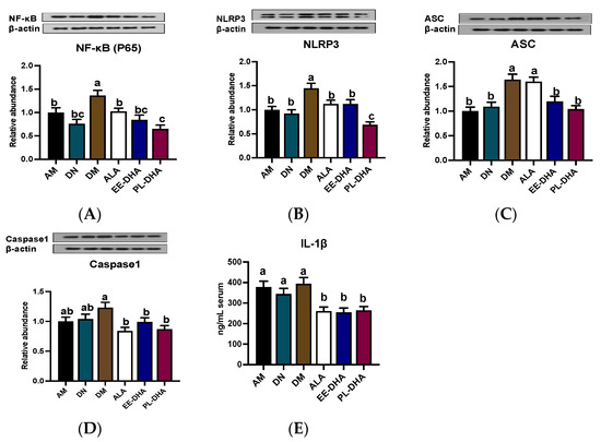 The NLPR3-inflammasome, composed of the NLRP3 scaffold, apoptotic speck-containing protein (ASC) linker, caspase1, and the upstream NF-κB (P65), has been implicated in central nervous system (CNS) inflammatory diseases. As is shown in Figure 7, enhanced expression of NF-κB (P65), NLRP3, ASC, and caspase1 was observed in the n-3 PUFA-deficient group (DM) compared to the n-3 PUFA-adequate group (AM), suggesting that dietary n-3 PUFA deficiency aggravated the PTZ-induced activation of neuroinflammation. Moreover, supplementation with different types of n-3 PUFAs in adulthood could reduce protein expression to varying degrees, of which DHA-enriched phospholipids exhibited a noticeable effect in restoring the protein expression of NF-κB (P65) and NLRP3 (Figure 7A,B). It should be noted that supplementation with n-3 PUFAs had a similar regulatory effect on the expression of ASC and caspase1 (Figure 7C,D). However, the effect of α-LNA on the reduction of ASC expression was not comparable to that of DHA-enriched ethyl ester and DHA-enriched phospholipid. Besides, there was no significant difference among the three n-3 PUFA-supplemented groups in the regulation of caspase1. IL-1β, as the downstream of NLRP3 pathway, was increased in PTZ treated n-3 PUFAs deficiency group (DM) compared with that of the n-3 PUFA-adequate group (AM). Mice lacking n-3 PUFAs in early life supplemented with n-3 PUFAs in adulthood could reduce IL-1β levels, although the effect differed little among different forms of n-3 PUFAs (Figure 7E).