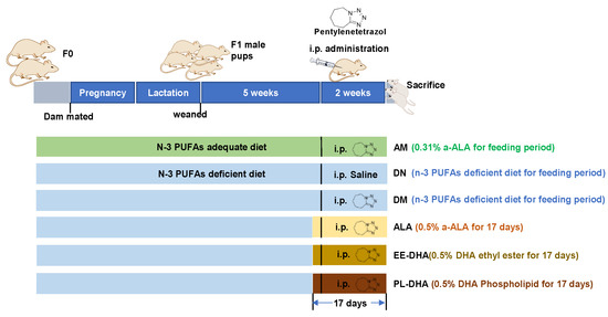 All animal experimental procedures were performed according to the guidelines of the Ethical Committee of the College of Food Science and Engineering of the Ocean University of China (Approval No. SPXY2020012). Male and female ICR mice (weight 25–30 g, 8 weeks old) were purchased from Ji’nan Pengyue Laboratory Animal Breeding CO., Ltd. (Ji’nan, China) and housed at the SPF animal room under a temperature of 20 ± 2 °C and a humidity of 60% with a 12/12 h light/dark cycle (light starting at 8 a.m.). After 1 week of acclimatization, 18 male and 18 female mice (F0) were mated at the sex ratio of 1:1 and divided into two groups, in which six male and six female mice were fed with an n-3 PUFAs-adequate diet (containing 0.31% α-linolenic acid [α-LNA]), and the other mice were fed with an n-3 PUFAs-deficient diet modified from the standard AIN-93G diet. A single male and a single female were continuously housed together in a mouse cage from the mating period until the delivery of pups at postnatal days three to five. The pregnant dam continued to consume her assigned diets throughout gestation and lactation. The male offspring were weaned at 21 days of age and housed in groups of three to four animals per cage with food and water ad libitum. The offspring (F1) were kept on the same diet as their mothers (Figure 8). At eight weeks of age, male offspring fed an adequate n-PUFA diet were injected with 35 mg/kg·bw pentylenetetrazol (AM). The male offspring fed with a n-3 PUFA deficiency diet (α-LNA < 0.1%) were randomly assigned to five subgroups (n = 10 male mice per group), including one group injected intraperitoneally with saline (DN), and the other four groups were injected with 35 mg/kg·bw pentylenetetrazol (PTZ) and fed with n-3 PUFA-deficient diet (DM), α-LNA-enriched diet (ALA), a DHA-enriched ethyl ester-containing diet (EE-DHA), and a DHA-enriched phospholipids-containing diet (PL-DHA). The n-3 PUFA-enriched oil added to α-linolenic acid enriched diet was flaxseed oil. The oil added to the DHA-enriched ethyl ester-containing diet was ethyl ester fish oil, and for DHA-enriched phospholipid-containing diet was phospholipids extracted from squid roes. The n-3 PUFAs content in the ALA, EE-DHA, and PL-DHA groups was 0.5% w/w of the diet.