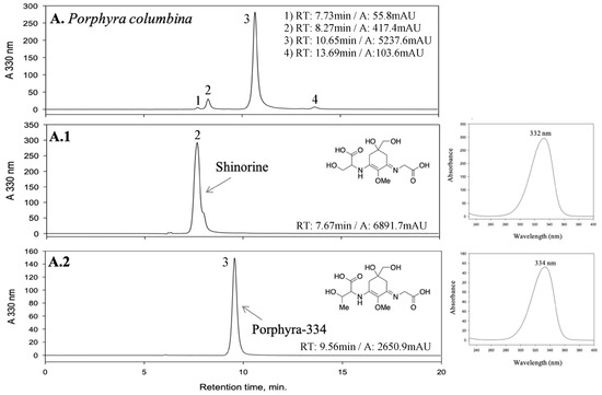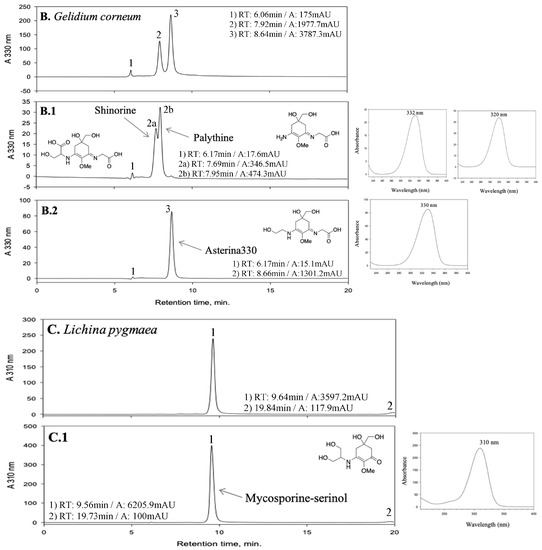 HPLC chromatograms of two red macroalgae (Pyropia columbina and Gelidium corneum) and a marine lichen (Lichina pygmaea) extracts, and the fractions obtained enriched in mycosporine-like amino acids (MAAs) from each extract, with the retention time (RT) and area (A) of the peaks. The UV-spectrum, maximum absorbance and chemical structure of each identified MAA is also present. (A) Pyropia columbina extract, (A.1) Shinorine-enriched fraction, (A.2) Porphyra-334-enriched fraction; (B) Gelidium corneum extract, (B.1) Palythine-enriched fraction (with shinorine), (B.2) Asterina-330-enriched fraction; (C) Lichina pygmaea extract and (C.1) Mycosporine-serinol-enriched fraction.