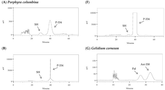 The yield of the different aqueous extractions was about 20% for all species. Figure 1A–C show the chromatograms of the individual extracts. The extract of Pyropia columbina (Figure 1A) showed two major peaks in the chromatogram, identified as shinorine (SH; λmax: 332 nm) and porphyra-334 (P-334; λmax: 334 nm). The predominant MAA was P-334 (>90%). The Gelidium corneum extract (Figure 1B) has two peaks identified as palythine (Pal; λmax: 320 nm) and asterina-330 (Ast-330; λmax: 330 nm). In this case, the content of Ast-330 was almost 2.5-fold higher than that of Pal (70 versus 30%). Finally, Lichina pygmaea (Figure 1C) had only one peak, identified as mycosporine-serinol (M-ser; λmax: 310 nm). P. columbina had the highest content of MAAs (31.25 ± 2.93 mg g−1 dry extract (DE) = 6.25 mg g−1 dry biomass (DB)), followed by L. pygmaea (15.40 ± 0.83 mg g−1DE = 3.08 mg g−1DB) and G. corneum (6.32 ± 0.27 mg g−1DE = 1.26 mg g−1DB). Similar results were observed by other authors in species of the same genus. In Pyropia columbina (=Porphyra columbina), Phycocalidia acanthophora (=Pyropia acanthophora), Porphyra umbilicalis and Neopyropia elongata (=Pyropia elongata), different authors determined values ranging from 5.2 to 10.6 mg g−1DB [46,47,48,49]. All observed that the predominant MAAs were P-334 and SH. In Gelidium sp., the same authors observed values around 0.3–6.8 mg g−1DB and greater variability in MAAs patterns. In L. pygmaea [27,50], values of 1.1 mg g−1DB of a MAA that absorbed at 310 nm were observed. Initially, this MAA was identified as mycosporine-glycine by HPLC [27], although more recent works have identified it as M-ser [31] by MS. Roullier et al. [43], who also identified M-ser in L. pygmaea.