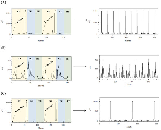 In order to increase the throughput of the process, a continuous isolation method using multiple sequential injections with an elution–extrusion mode (EE) was studied [40]. The development of two sequential injections for each species is shown in Figure 3. After separation of the target compounds from the extracts of P. columbina, G. corneum, and L. pygmaea, the EE was applied for 20 min. EE allows for the complete replacement of the stationary phase inside the column by a new one. After that, the hydrodynamic equilibrium was achieved (20 min), and a new separation cycle could be performed. These results indicated that more sample injections could be performed for the isolation of the different MAAs; therefore, following this methodology, a multiple sequential injection HPCCC method was applied (Figure 3). In the case of P. columbina and G. corneum, eight sequential injections were performed; however, in the case of L. pygmaea, only three sequential injections were possible because higher sample loading was achieved, and little collected biomass was available. The total sequential multiple injections lasted 675, 635, and 325 min for P. columbina, G. corneum, and L. pygmaea, respectively. In the three cases, the time included 15 min for the first filling of the column and 20 min for the first hydrodynamic equilibrium. If the same number of injections were performed with L. pygmaea as in the other species, the time would be 875 min. The developed method consumed 2.13 L of solvents in the case of P. columbina, 2.01 L of solvents in the case of G. corneum, and 1.08 L of solvents in the case of L. pygmaea (if the extract of L. pygmaea were injected the same times as in the other species, 2.73 L of solvents would be consumed). The developed HPCCC method afforded five different MAA fractions enriched with Pal (1.94 mg), Ast-330 (2.76 mg), SH (14.76 mg), P-334 (203.46 mg) and M-ser (46.63 mg) with recoveries of 63.9, 50.7, 50.1, 92.3 and 84.1%, respectively. The chromatograms of the different MAA-enriched fractions are observed in Figure 1. The relative standard deviation (RSD) between the obtained MAAs in the different separation cycles was 6.7, 5.8, 5.5, 13.6 and 3.3% for Pal, Ast-330, SH, P-334 and M-ser, respectively. In most cases, good reproducibility was obtained, and only P-334 showed an RSD greater than 10, indicating greater variability between separation cycles [40].