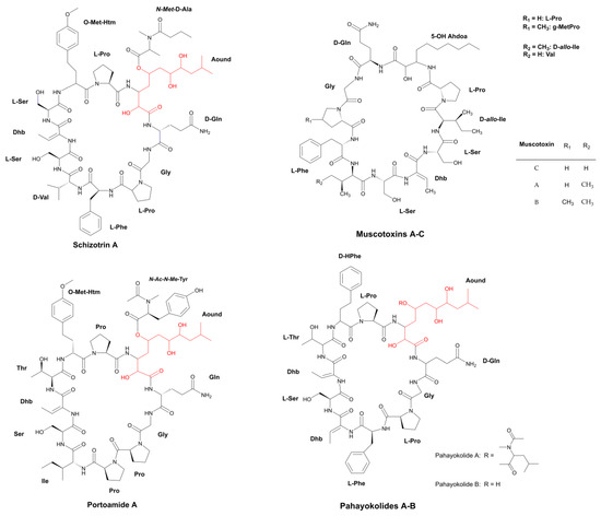 - Pergament, I.; Carmeli, S. Schizotrin A; a Novel Antimicrobial Cyclic Peptide from a Cyanobacterium. Tetrahedron Lett. 1994, 35, 8473–8476. [Google Scholar] [CrossRef]