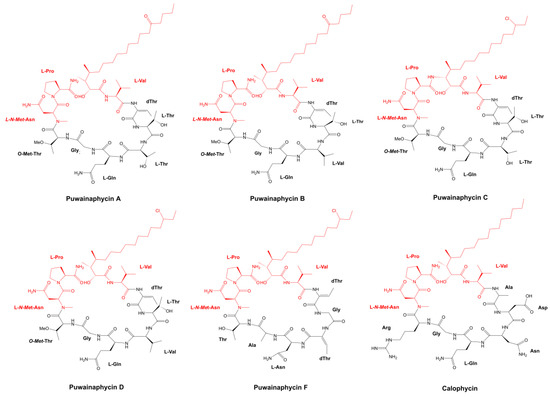 - Mareš, J.; Jek, J.H.; Urajová, P.; Kopecký, J.; Hrouzek, P. A Hybrid Non-Ribosomal Peptide/Polyketide Synthetase Containing Fatty-Acyl Ligase (Faal) Synthesizes the b- Amino Fatty Acid Lipopeptides Puwainaphycins in the Cyanobacterium Cylindrospermum alatosporum. PLoS ONE 2014, 9, e111904. [Google Scholar] [CrossRef] [PubMed]