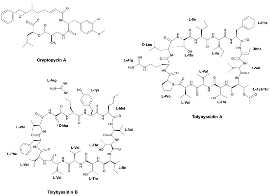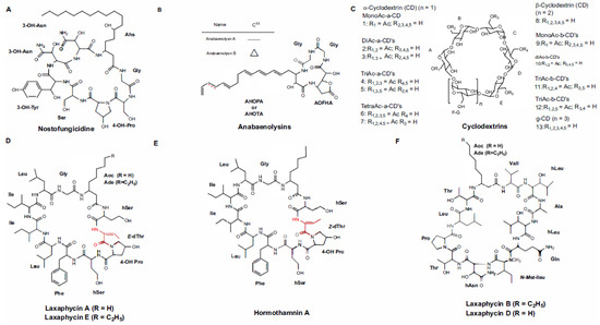 - Frankmölle, W.P.; Knübel, G.; Moore, R.E.; Patterson, G.M. Antifungal Cyclic Peptides from the Terrestrial Blue-Green Alga Anabaena laxa. J. Antibiot. 1992, 45, 1458–1466. [Google Scholar] [CrossRef]