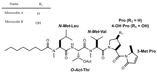 - Yu, H.B.; Glukhov, E.; Li, Y.; Iwasaki, A.; Gerwick, L.; Dorrestein, P.C.; Jiao, B.H.; Gerwick, W.H. Cytotoxic Microcolin Lipopeptides from the Marine Cyanobacterium Moorea producens. J. Nat. Prod. 2019, 82, 2608–2619. [Google Scholar] [CrossRef]