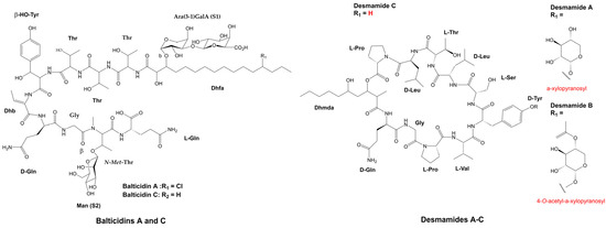 - Kajiyama, S.I.; Kanzaki, H.; Kawazu, K.; Kobayashi, A. Nostofungicidine, an Antifungal Lipopeptide from the Field-Grown Terrestrial Blue-Green Alga Nostoc commune. Tetrahedron Lett. 1998, 39, 3737–3740. [Google Scholar] [CrossRef]