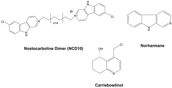 - Vasas, G.; Borbely, G.; Nanasi, P.; Nanasi, P.P. Alkaloids from Cyanobacteria with Diverse Powerful Bioactivities. Mini. Rev. Med. Chem. 2010, 10, 946–955. [Google Scholar] [CrossRef]
