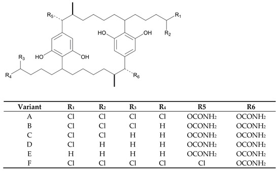 | Carbamidocyclophane B | 774.21 | Nostoc sp. CAVN10 | Terrestrial | Vietnam | [240] |