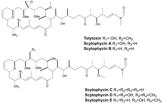 | Scytophycin A | 822.08 | S. pseudohofmanni ATCC 53141 (Scytonemataceae) | Terrestrial | Island of Oahu (Hawaii, U.S) | [103] |